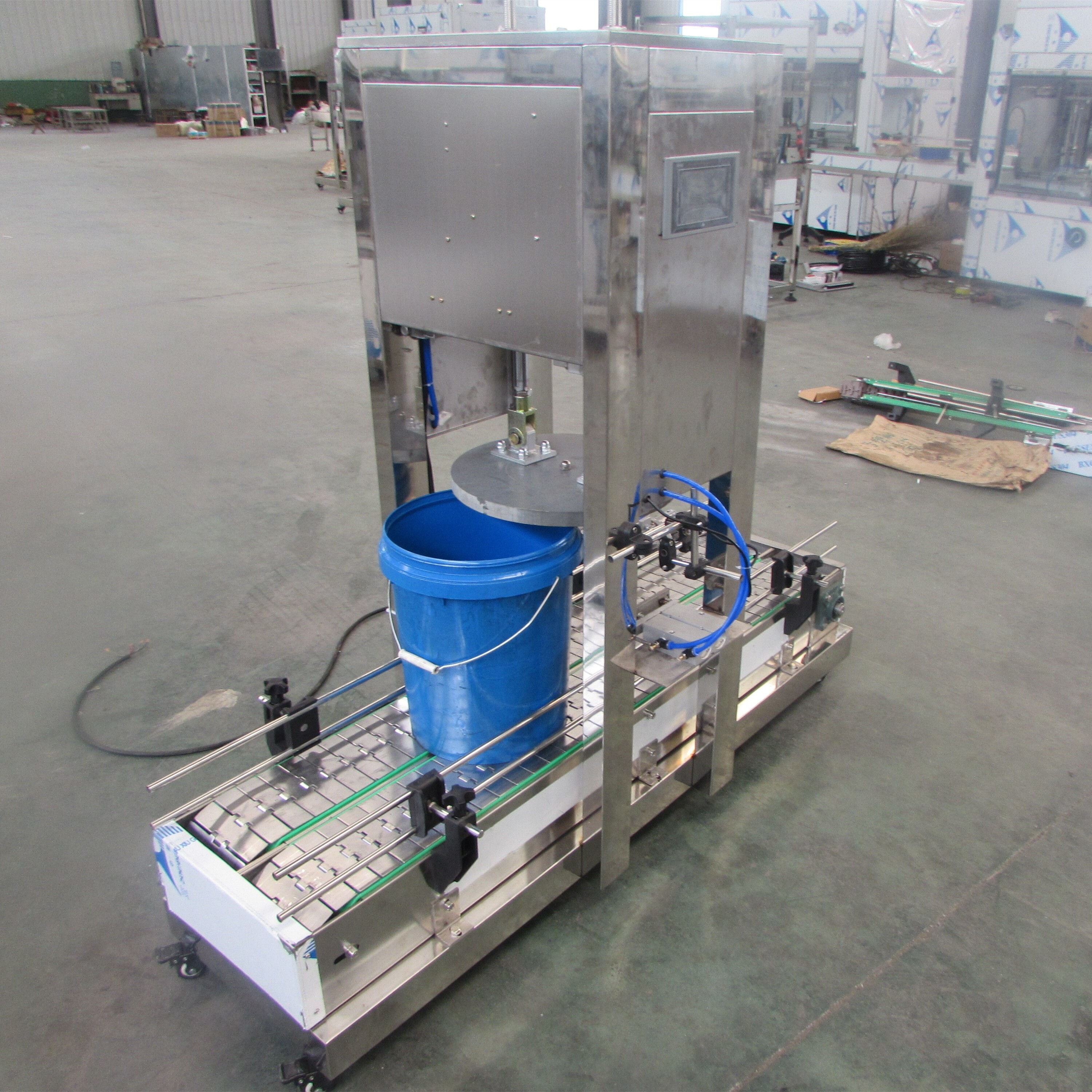 Computer control, easy to operate, convenient to use. The capping machine is an important component of the production line, located behind the filling equipment, to complete the capping of the center barrel. The capping machine is a one-time capping machine to ensure tight capping and smooth capping after capping. The capping machine positions the heavy drum directly below the capping plate and performs automatic capping work after positioning. Suitable for capping plastic drums such as oil coatings, latex paints, etc. (This machine can be customized according to customer requirements)"